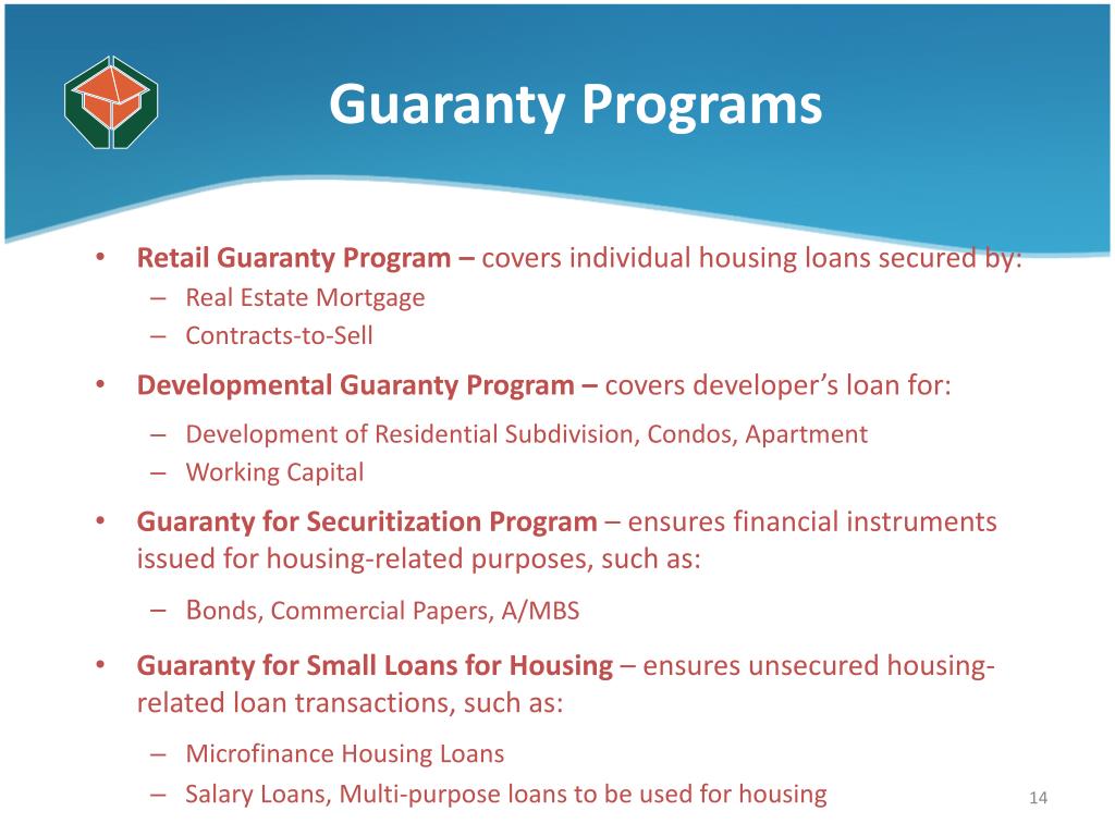 Guaranty Programs • Retail Guaranty Program – covers individual housing loans secured by: • Real Estate Mortgage • Contracts-to-Sell • Developmental Guaranty Program – covers developer’s loan for: • Development of Residential Subdivision, Condos, Apartment • Working Capital • Guaranty for Securitization Program – ensures financial instruments issued for housing-related purposes, such as: • Bonds, Commercial Papers, A/MBS • Guaranty for Small Loans for Housing – ensures unsecured housing-related loan transactions, such as: • Microfinance Housing Loans • Salary Loans, Multi-purpose loans to be used for housing
