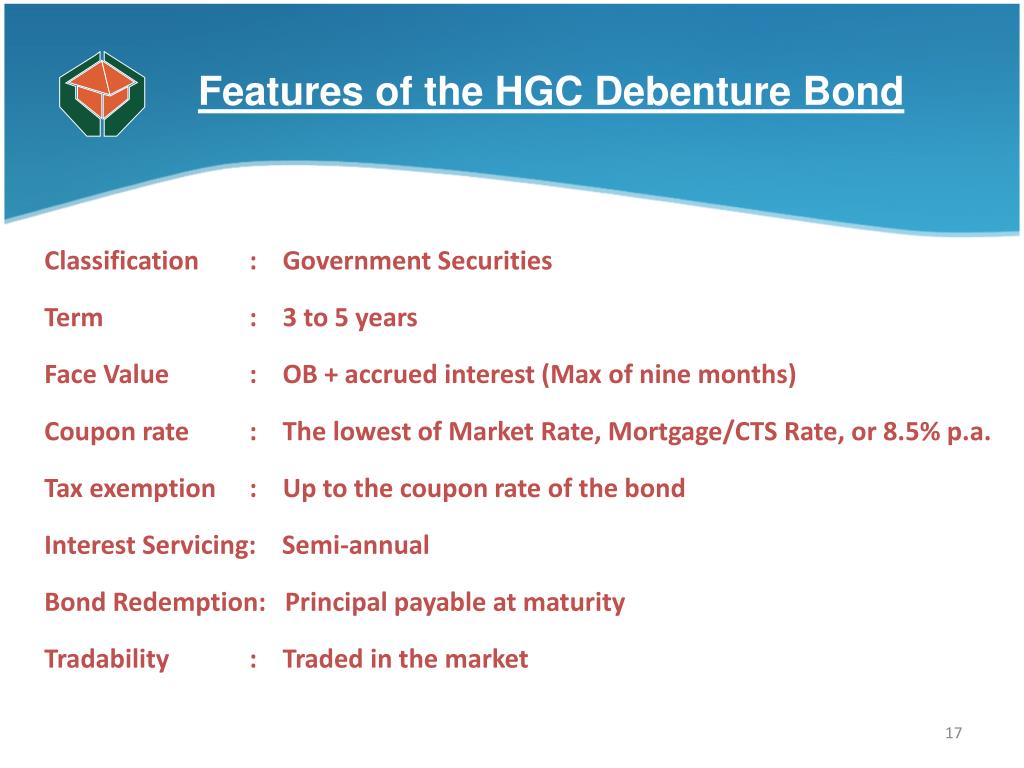 Features of the HGC Debenture Bond Classification : Government Securities Term : 3 to 5 years Face Value : OB + accrued interest (Max of nine months) Coupon rate : The lowest of Market Rate, Mortgage/CTS Rate, or 8.5% p.a. Tax exemption : Up to the coupon rate of the bond Interest Servicing: Semi-annual Bond Redemption: Principal payable at maturity Tradability: Traded in the market