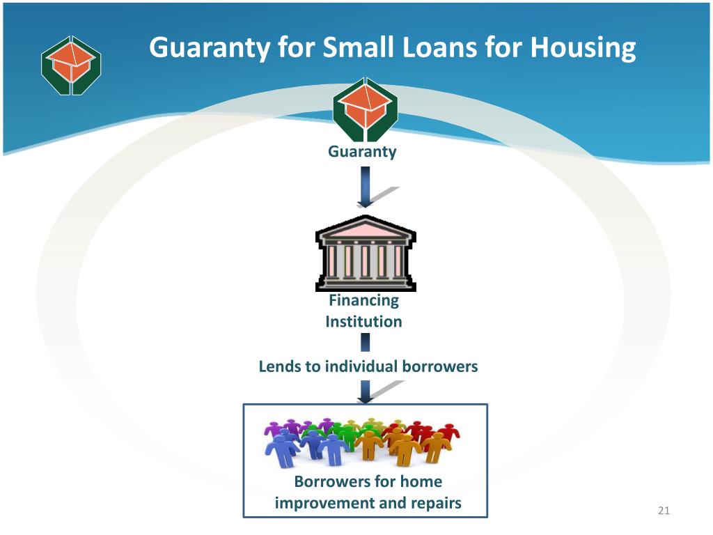Guaranty for Small Loans for Housing Guaranty Financing Institution Lends to individual borrowers Borrowers for home improvement and repairs