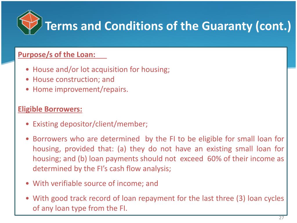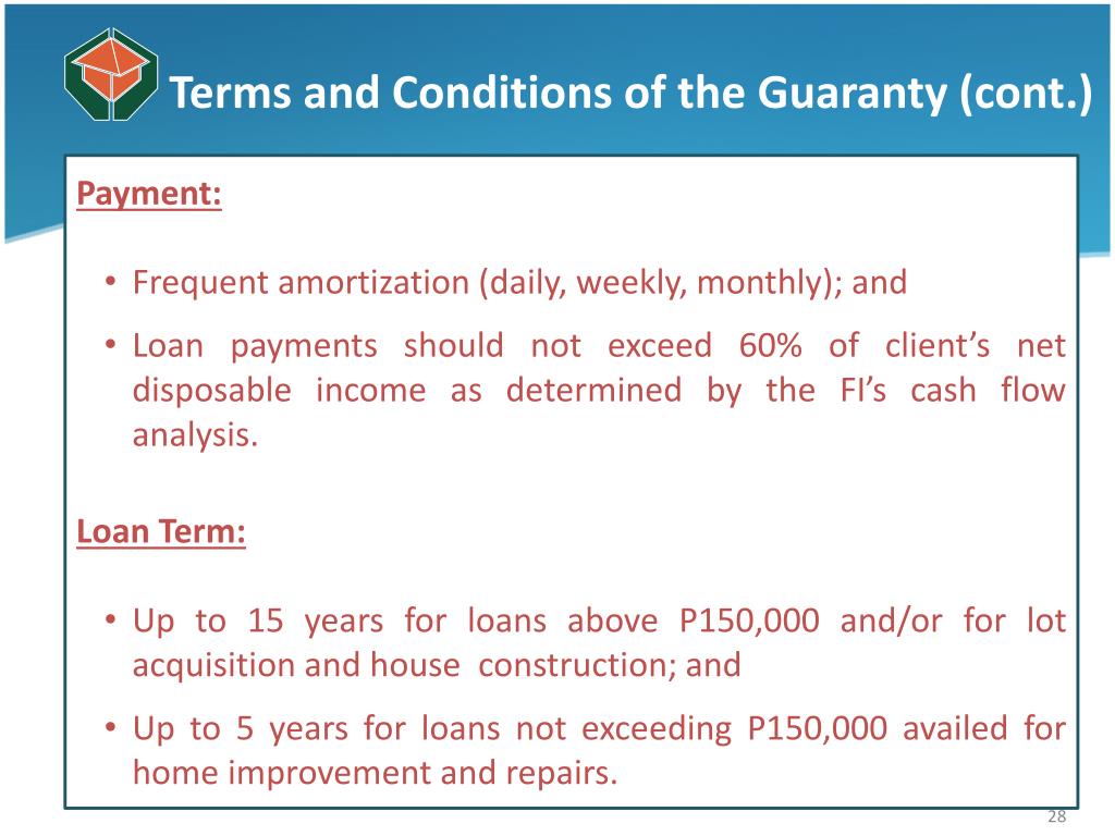 Terms and Conditions of the Guaranty (cont.) • Purpose/s of the Loan: • House and/or lot acquisition for housing; • House construction; and • Home improvement/repairs. • Eligible Borrowers: • Existing depositor/client/member; • Borrowers who are determined by the FI to be eligible for small loan for housing, provided that: (a) they do not have an existing small loan for housing; and (b) loan payments should not exceed 60% of their income as determined by the FI’scash flow analysis; • With verifiable source of income; and • With good track record of loan repayment for the last three (3) loan cycles of any loan type from the FI. 27