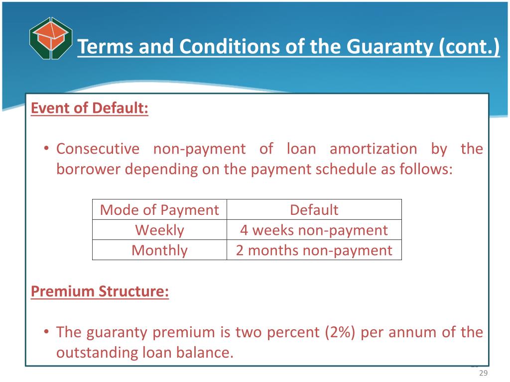Terms and Conditions of the Guaranty (cont.) • Payment: • Frequent amortization (daily, weekly, monthly); and • Loan payments should not exceed 60% of client’s net disposable income as determined by the FI’scash flow analysis. • Loan Term: • Up to 15 years for loans above P150,000 and/or for lot acquisition and house construction; and • Up to 5 years for loans not exceeding P150,000 availed for home improvement and repairs. 28