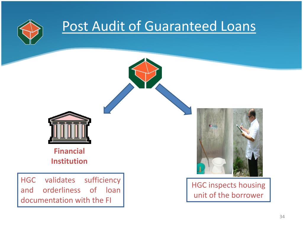 Post Audit of Guaranteed Loans HGC validates sufficiency and orderliness of loan documentation with the FI HGC inspects housing unit of the borrower Financial Institution
