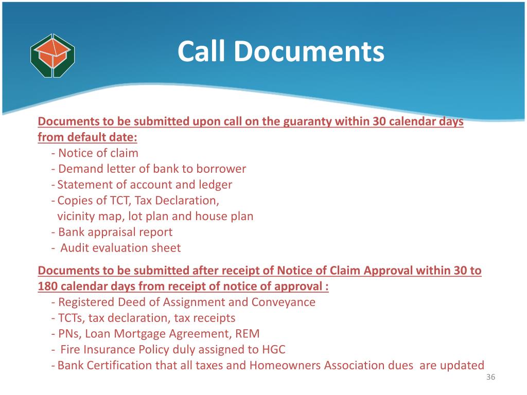 Call Documents • Documents to be submitted upon call on the guaranty within 30 calendar days from default date: • - Notice of claim • - Demand letter of bank to borrower • Statement of account and ledger • Copies of TCT, Tax Declaration, • vicinity map, lot plan and house plan • - Bank appraisal report • Audit evaluation sheet • Documents to be submitted after receipt of Notice of Claim Approval within 30 to 180 calendar days from receipt of notice of approval : • - Registered Deed of Assignment and Conveyance • - TCTs, tax declaration, tax receipts • - PNs, Loan Mortgage Agreement, REM • Fire Insurance Policy duly assigned to HGC • Bank Certification that all taxes and Homeowners Association dues are updated
