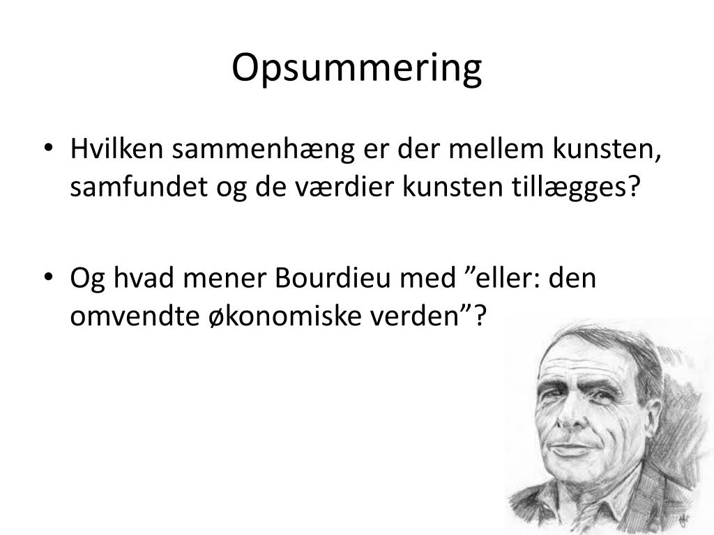 Opsummering • Hvilken sammenhæng er der mellem kunsten, samfundet og de værdier kunsten tillægges? • Og hvad mener Bourdieu med ”eller: den omvendte økonomiske verden”?