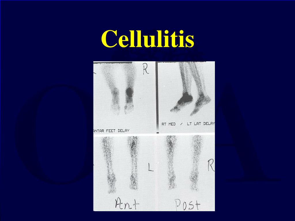 99M Tc • 3 Phase Bone Scan • Radionucleotide angiogram • Immediate post injection blood pool • Three hour: soft tissue, urinary excretion • Diagnosis • Cellulitis: Phases 1 &2, no change 3 • Osteomyelitis: Phases 1 & 2, focal 3 • Results: 94% sensitivity, 95% specificity • Rosenthal 1992, Schauwecker 1992
