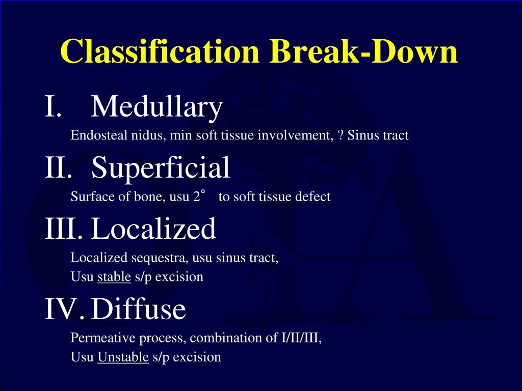 Classification Break-Down • Medullary Endosteal nidus, min soft tissue involvement, ? Sinus tract • Superficial Surface of bone, usu 2° to soft tissue defect • Localized Localized sequestra, usu sinus tract, Usu stables/p excision • Diffuse Permeative process, combination of I/II/III, Usu Unstable s/p excision