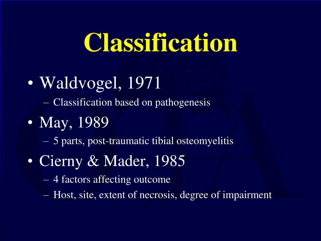 Classification • Waldvogel, 1971 • Classification based on pathogenesis • May, 1989 • 5 parts, post-traumatic tibial osteomyelitis • Cierny & Mader, 1985 • 4 factors affecting outcome • Host, site, extent of necrosis, degree of impairment