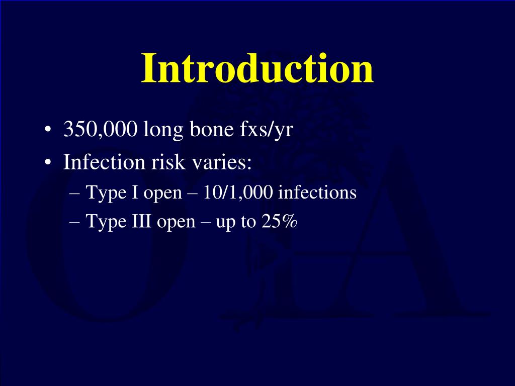 Introduction • 350,000 long bone fxs/yr • Infection risk varies: • Type I open – 10/1,000 infections • Type III open – up to 25%
