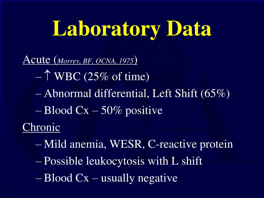 Laboratory Data Acute (Morrey, BF, OCNA, 1975) • WBC (25% of time) • Abnormal differential, Left Shift (65%) • Blood Cx – 50% positive Chronic • Mild anemia, WESR, C-reactive protein • Possible leukocytosis with L shift • Blood Cx – usually negative