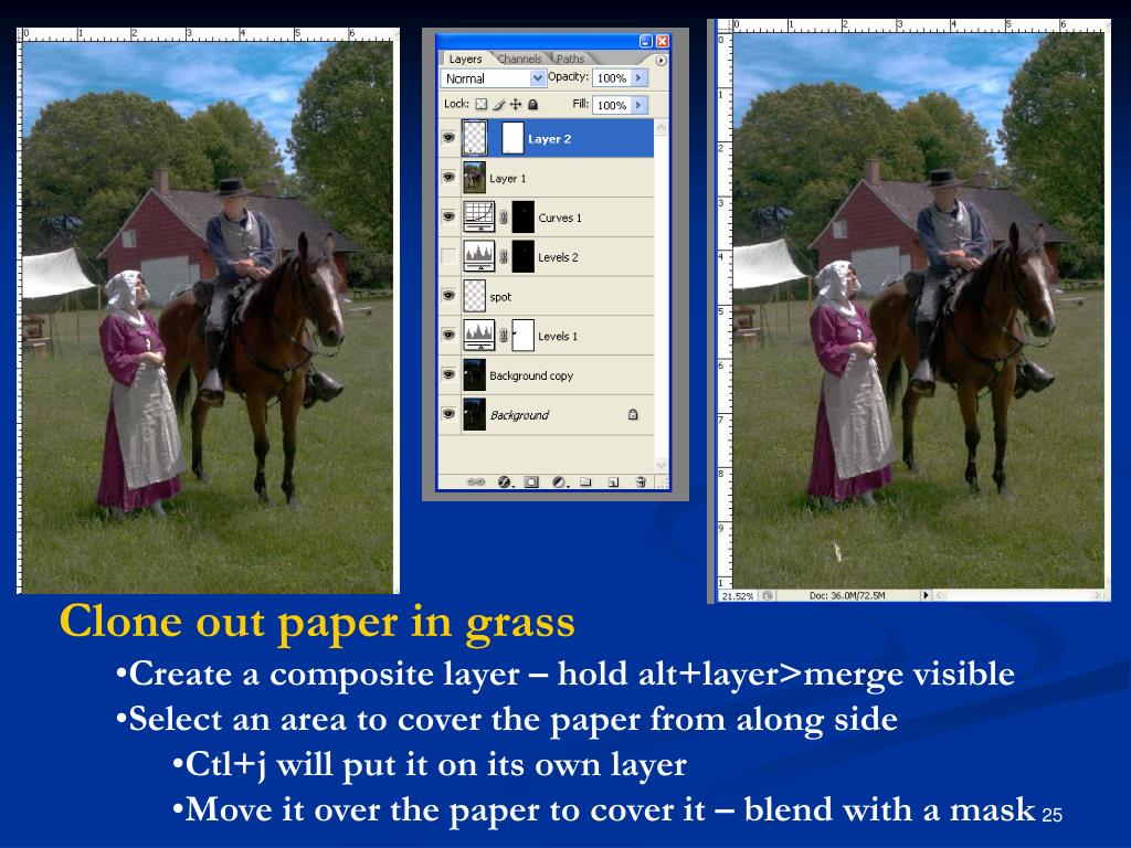 Clone out paper in grass • Create a composite layer – hold alt+layer>merge visible • Select an area to cover the paper from along side • Ctl+j will put it on its own layer • Move it over the paper to cover it – blend with a mask
