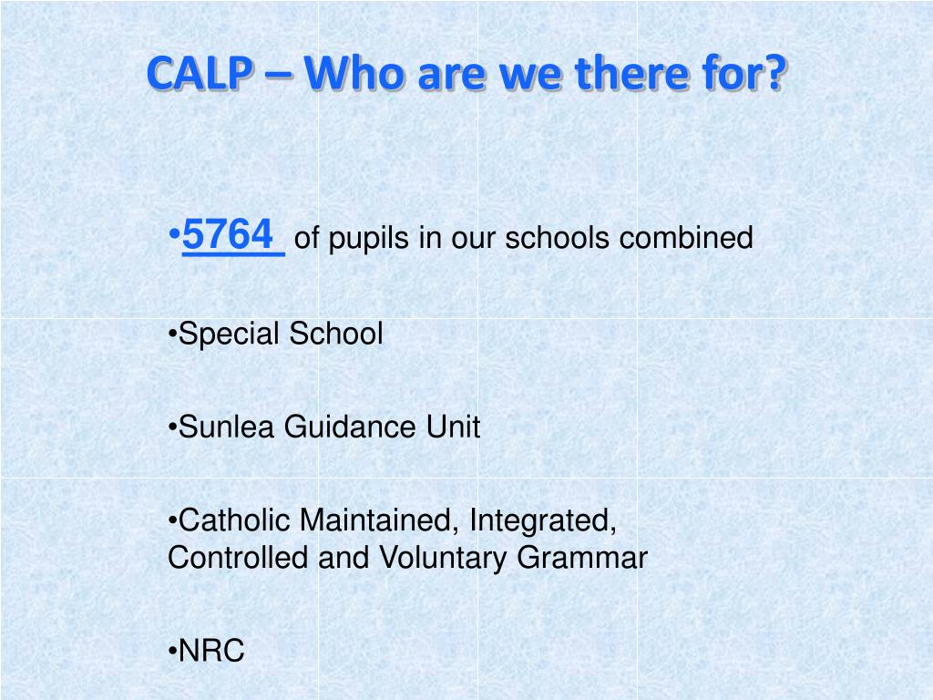 CALP – Who are we there for? • 5764 of pupils in our schools combined • Special School • Sunlea Guidance Unit • Catholic Maintained, Integrated, Controlled and Voluntary Grammar • NRC