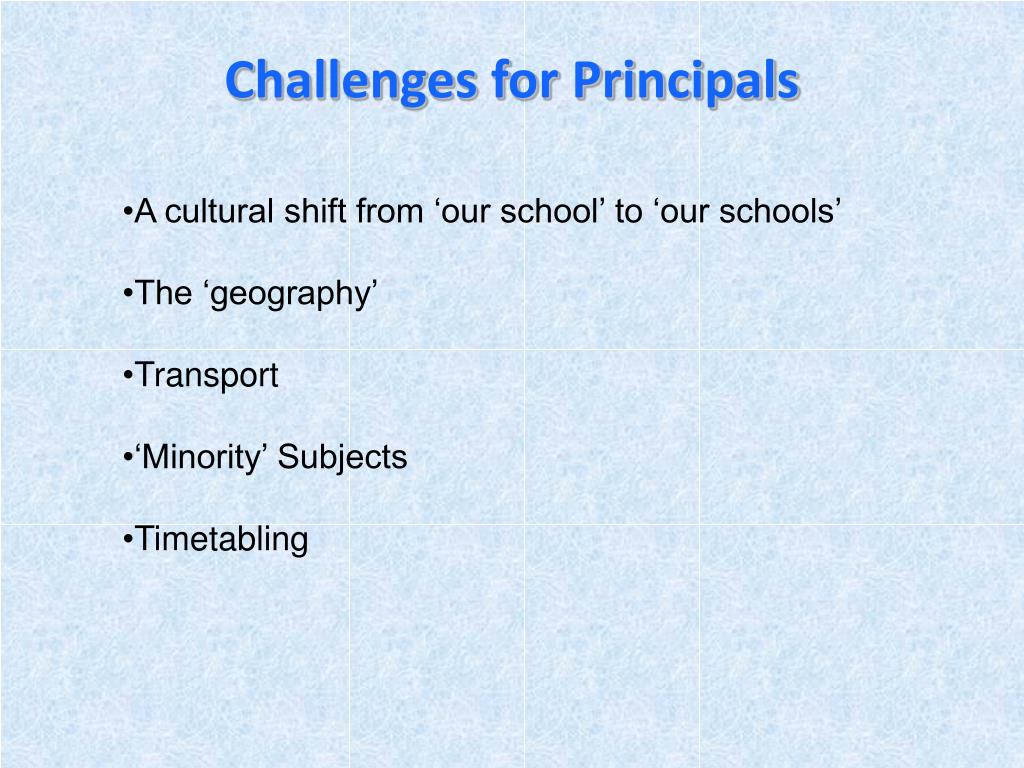 Challenges for Principals • A cultural shift from ‘our school’ to ‘our schools’ • The ‘geography’ • Transport • ‘Minority’ Subjects • Timetabling
