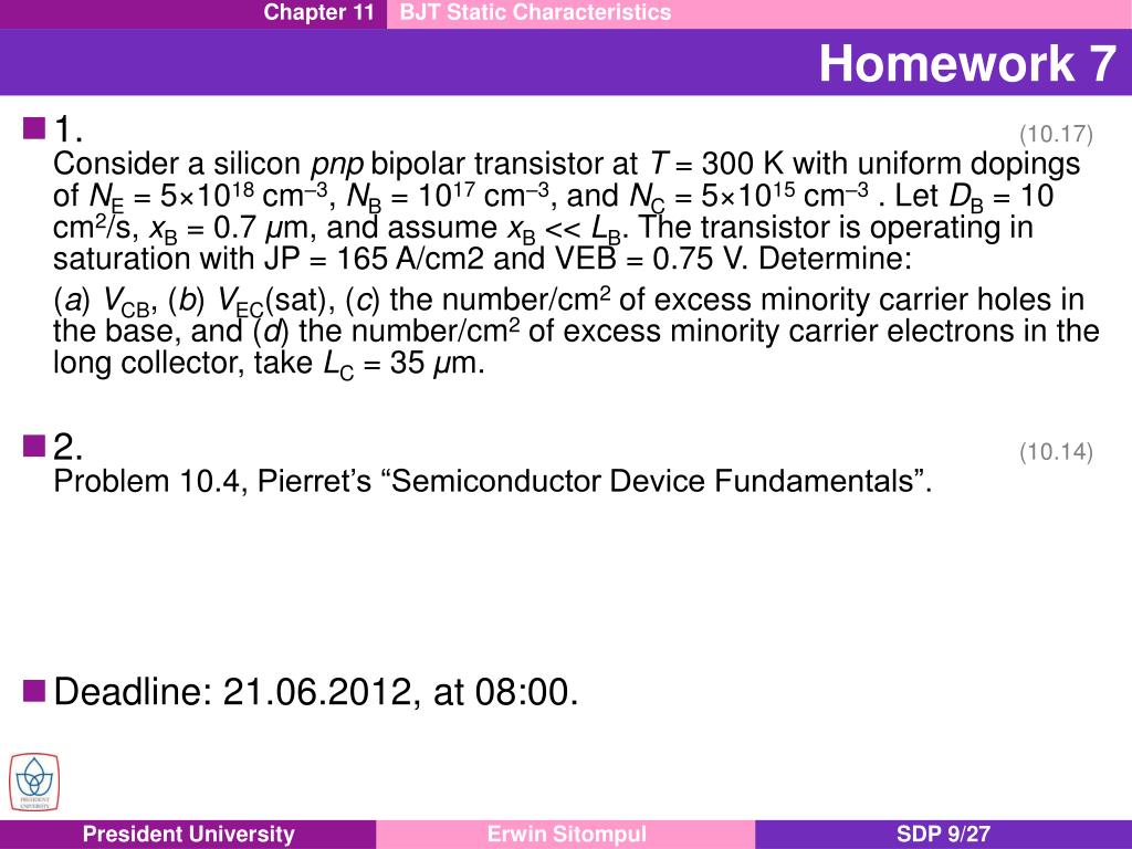 Chapter 11 BJT Static Characteristics Homework 7 • 1. (10.17) • Consider a silicon pnpbipolar transistor at T = 300 K with uniform dopings of NE = 5×1018 cm–3, NB = 1017 cm–3, and NC = 5×1015 cm–3 . Let DB = 10 cm2/s, xB = 0.7 μm, and assume xB << LB. The transistor is operating in saturation with JP = 165 A/cm2 and VEB = 0.75 V. Determine: • (a) VCB, (b) VEC(sat), (c) the number/cm2 of excess minority carrier holes in the base, and (d) the number/cm2 of excess minority carrier electrons in the long collector, take LC = 35 μm. • 2. (10.14) • Problem 10.4, Pierret’s “Semiconductor Device Fundamentals”. • Deadline: 21.06.2012, at 08:00.