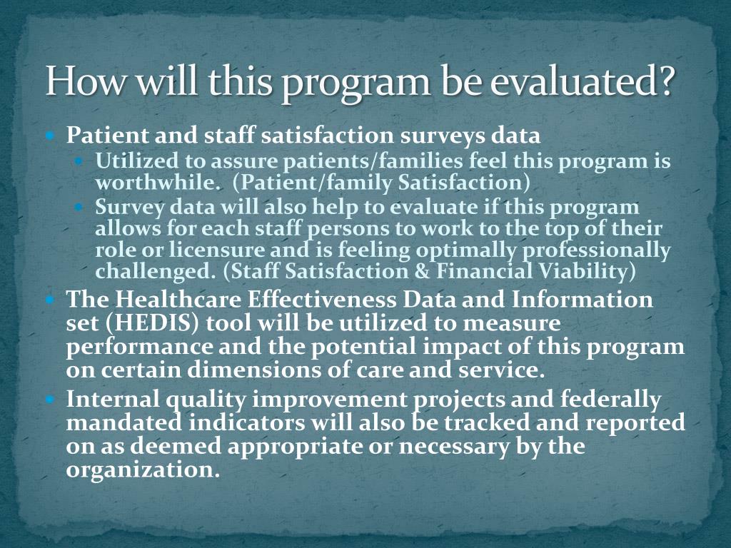 How will this program be evaluated? • Patient and staff satisfaction surveys data • Utilized to assure patients/families feel this program is worthwhile. (Patient/family Satisfaction) • Survey data will also help to evaluate if this program allows for each staff persons to work to the top of their role or licensure and is feeling optimally professionally challenged. (Staff Satisfaction & Financial Viability) • The Healthcare Effectiveness Data and Information set (HEDIS) tool will be utilized to measure performance and the potential impact of this program on certain dimensions of care and service. • Internal quality improvement projects and federally mandated indicators will also be tracked and reported on as deemed appropriate or necessary by the organization.