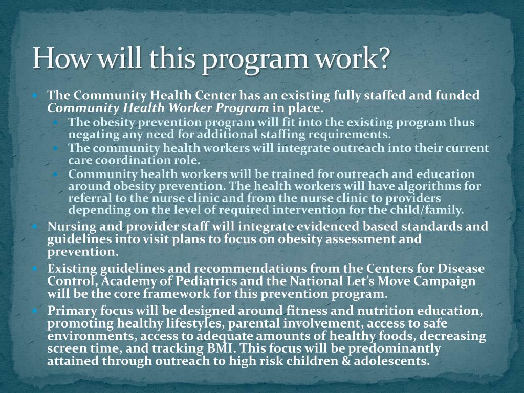 How will this program work? • The Community Health Center has an existing fully staffed and funded Community Health Worker Program in place. • The obesity prevention program will fit into the existing program thus negating any need for additional staffing requirements. • The community health workers will integrate outreach into their current care coordination role. • Community health workers will be trained for outreach and education around obesity prevention. The health workers will have algorithms for referral to the nurse clinic and from the nurse clinic to providers depending on the level of required intervention for the child/family. • Nursing and provider staff will integrate evidenced based standards and guidelines into visit plans to focus on obesity assessment and prevention. • Existing guidelines and recommendations from the Centers for Disease Control, Academy of Pediatrics and the National Let’s Move Campaign will be the core framework for this prevention program. • Primary focus will be designed around fitness and nutrition education, promoting healthy lifestyles, parental involvement, access to safe environments, access to adequate amounts of healthy foods, decreasing screen time, and tracking BMI. This focus will be predominantly attained through outreach to high risk children & adolescents.