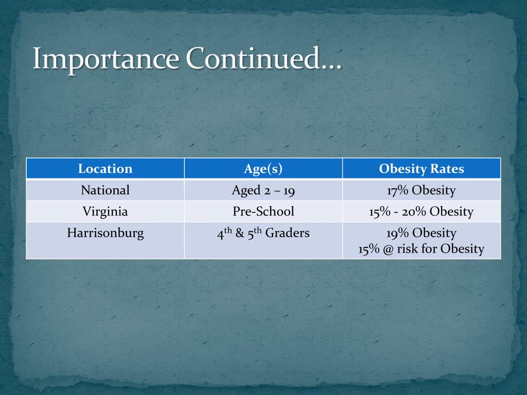 Child & Adolescent Obesity • WHY IS THIS IMPORTANT? • Obesity is a multifaceted issue with significant health, social, and fiscal consequences. • Addressing the obesity epidemic will require a comprehensive approach involving federal, state, and local public organizations, schools, communities, the medical community, as well as the food industries. Prevention of obesity is crucial to this effort particularly among children and youth. Intervention taken today to promote healthy behaviors among children, and their families and communities can begin to counteract the many factors contributing to the rising trend of obesity in America. • Healthy People 2020 have a goal to reduce the proportion of children and adolescents who are considered to be obese to 14.6%. • Healthy people 2020 suggests this goal can be accomplished through education, access to healthy foods, increased health care provider awareness and assessment of the child’s body mass index (BMI). • According to the Centers for Disease Control since 1980 childhood & adolescent obesity has tripled!