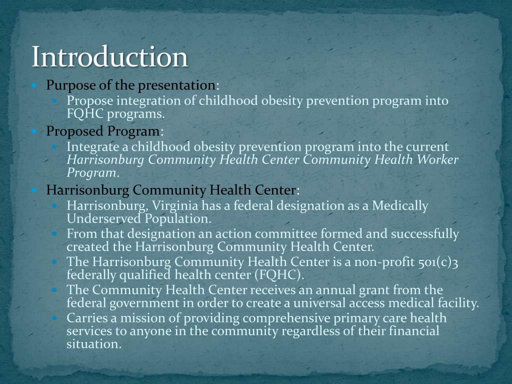 Introduction • Purpose of the presentation: • Propose integration of childhood obesity prevention program into FQHC programs. • Proposed Program: • Integrate a childhood obesity prevention program into the current Harrisonburg Community Health Center Community Health Worker Program. • Harrisonburg Community Health Center: • Harrisonburg, Virginia has a federal designation as a Medically Underserved Population. • From that designation an action committee formed and successfully created the Harrisonburg Community Health Center. • The Harrisonburg Community Health Center is a non-profit 501(c)3 federally qualified health center (FQHC). • The Community Health Center receives an annual grant from the federal government in order to create a universal access medical facility. • Carries a mission of providing comprehensive primary care health services to anyone in the community regardless of their financial situation.