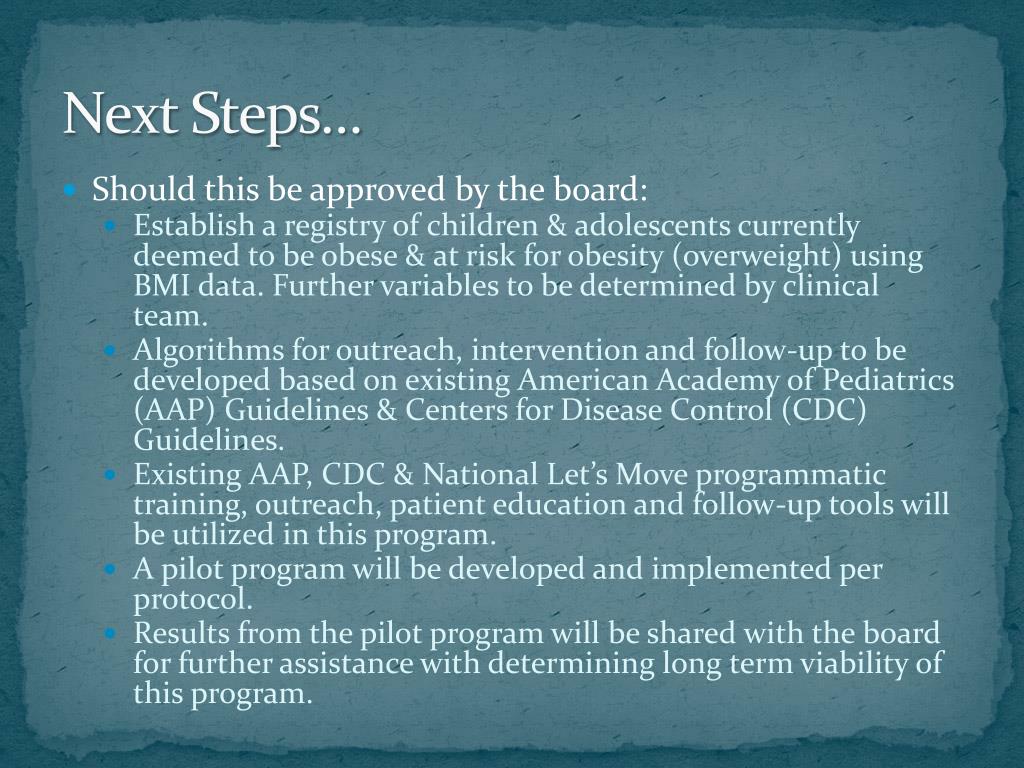 Next Steps… • Should this be approved by the board: • Establish a registry of children & adolescents currently deemed to be obese & at risk for obesity (overweight) using BMI data. Further variables to be determined by clinical team. • Algorithms for outreach, intervention and follow-up to be developed based on existing American Academy of Pediatrics (AAP) Guidelines & Centers for Disease Control (CDC) Guidelines. • Existing AAP, CDC & National Let’s Move programmatic training, outreach, patient education and follow-up tools will be utilized in this program. • A pilot program will be developed and implemented per protocol. • Results from the pilot program will be shared with the board for further assistance with determining long term viability of this program.