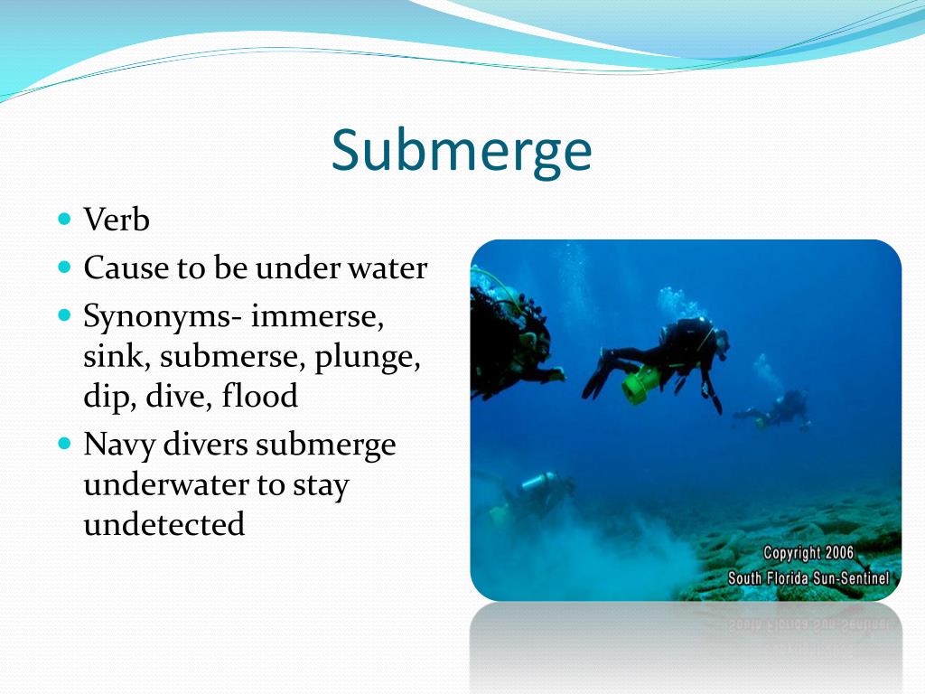 Submerge • Verb • Cause to be under water • Synonyms- immerse, sink, submerse, plunge, dip, dive, flood • Navy divers submerge underwater to stay undetected