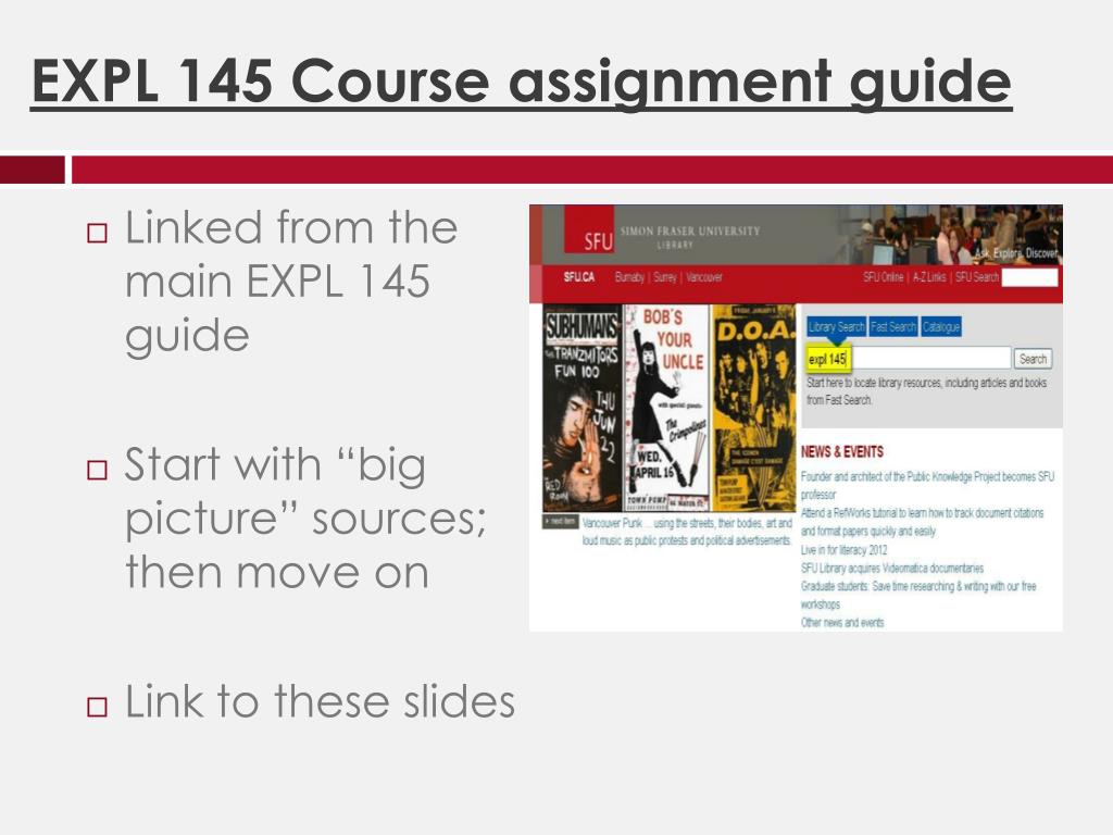 EXPL 145 Course assignment guide • Linked from the main EXPL 145 guide • Start with “big picture” sources; then move on • Link to these slides