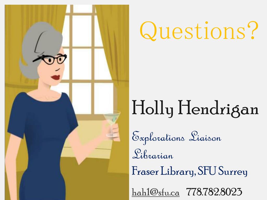Questions? Holly Hendrigan Explorations Liaison Librarian Fraser Library, SFU Surrey hah1@sfu.ca 778.782.8023