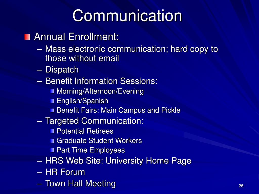 Communication • Annual Enrollment: • Mass electronic communication; hard copy to those without email • Dispatch • Benefit Information Sessions: • Morning/Afternoon/Evening • English/Spanish • Benefit Fairs: Main Campus and Pickle • Targeted Communication: • Potential Retirees • Graduate Student Workers • Part Time Employees • HRS Web Site: University Home Page • HR Forum • Town Hall Meeting
