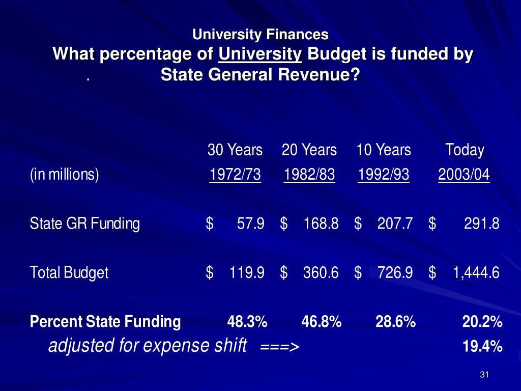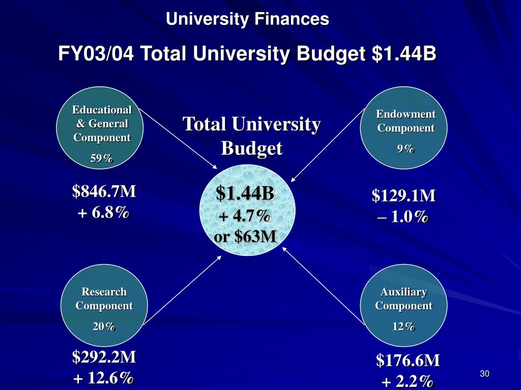University Finances FY03/04 Total University Budget $1.44B Educational & General Component 59% Endowment Component 9% Total University Budget $846.7M+ 6.8% $1.44B + 4.7% or $63M $129.1M – 1.0% Research Component 20% Auxiliary Component 12% $292.2M + 12.6% $176.6M + 2.2%