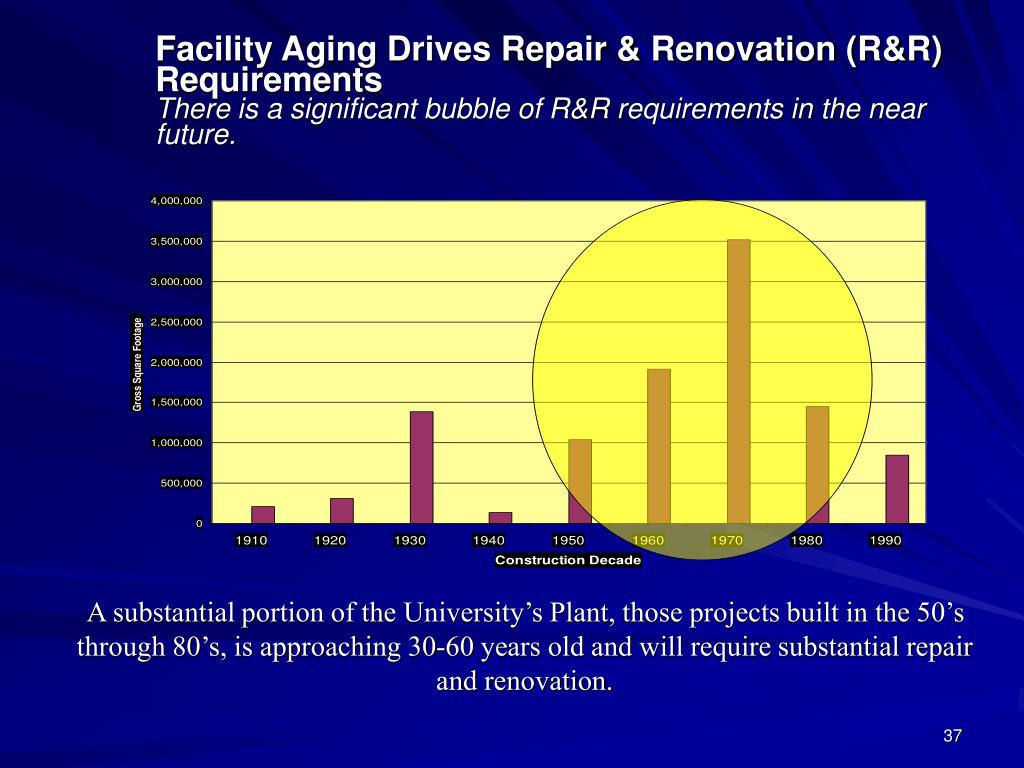 Facility Aging Drives Repair & Renovation (R&R) RequirementsThere is a significant bubble of R&R requirements in the near future. A substantial portion of the University’s Plant, those projects built in the 50’s through 80’s, is approaching 30-60 years old and will require substantial repair and renovation.