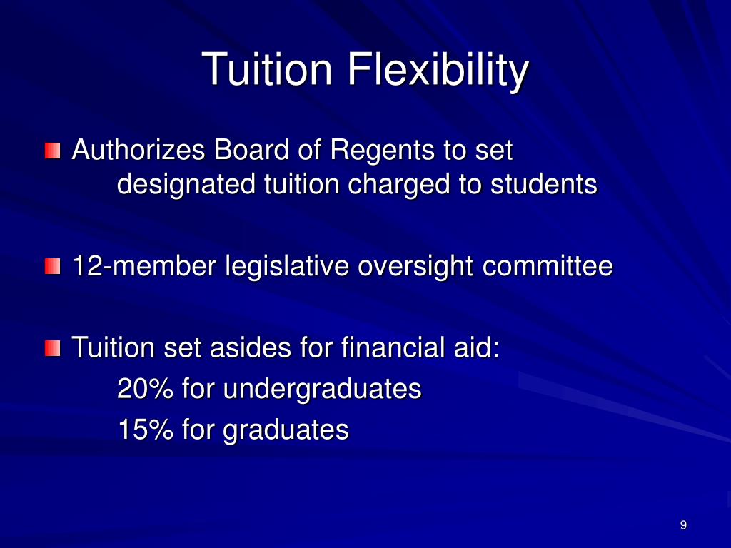 Tuition Flexibility • Authorizes Board of Regents to set designated tuition charged to students • 12-member legislative oversight committee • Tuition set asides for financial aid: 20% for undergraduates 15% for graduates