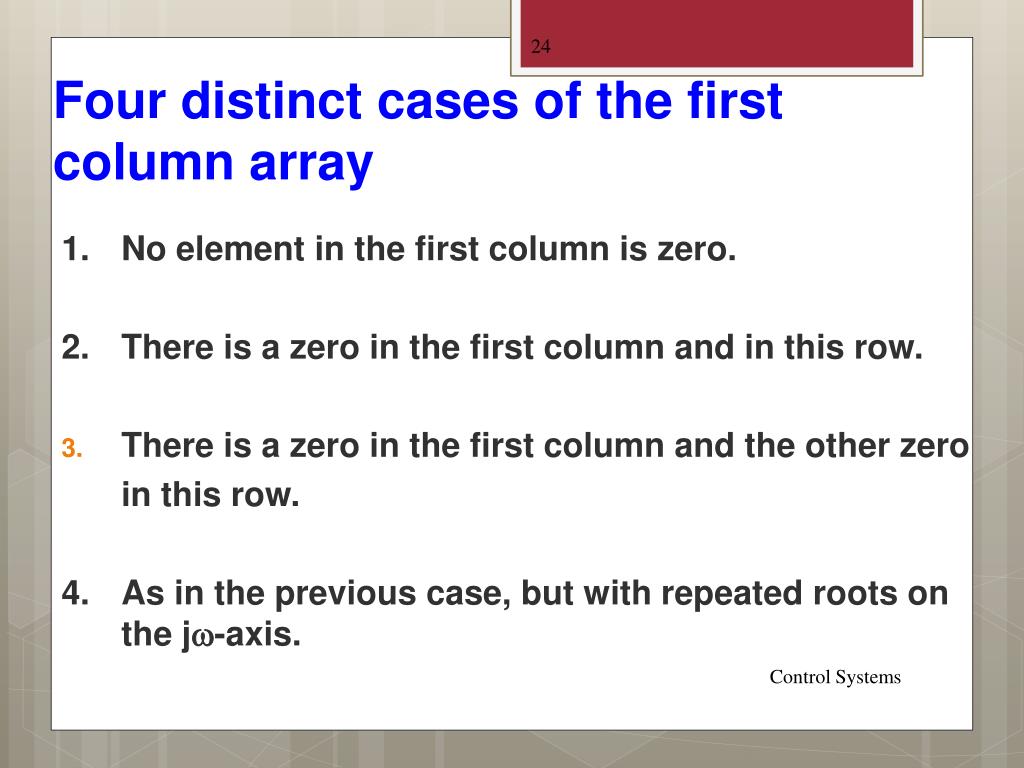 Four distinct cases of the first column array 1. No element in the first column is zero. 2. There is a zero in the first column and in this row. • There is a zero in the first column and the other zero in this row. 4. As in the previous case, but with repeated roots on the j-axis. Control Systems