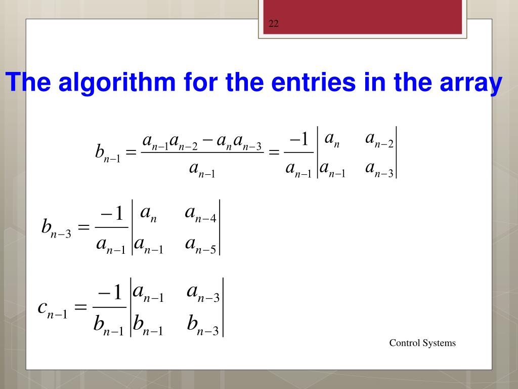 The Routh-Hurwitz rule • Rule If any of the coefficients ai, i = 0,1,2,…,n-1 are zero or negative, the system is not stable. It can be either unstable or neutrally stable. Control Systems