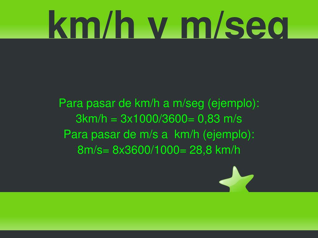 Para pasar de km/h a m/seg (ejemplo): 3km/h = 3x1000/3600= 0,83 m/s Para pasar de m/s a km/h (ejemplo): 8m/s= 8x3600/1000= 28,8 km/h km/h y m/seg
