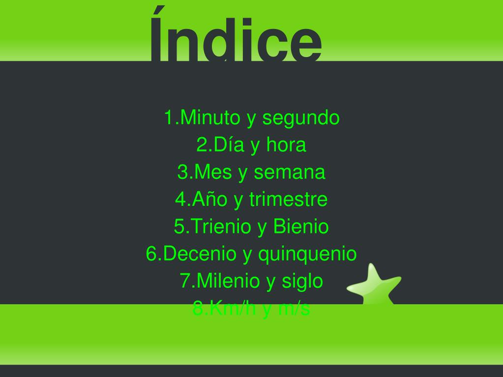 Medidas De Tiempo. 1.Minuto y segundo 2.Día y hora 3.Mes y semana 4.Año y trimestre 5.Trienio y Bienio 6.Decenio y quinquenio 7.Milenio y siglo 8.Km/h y m/s. Índice. Minuto y segundo. Minuto: 1min = 60 seg 60 min = 1h Segundo: 60 seg = 1 min 3600 seg= 1h. Día y hora. Día: