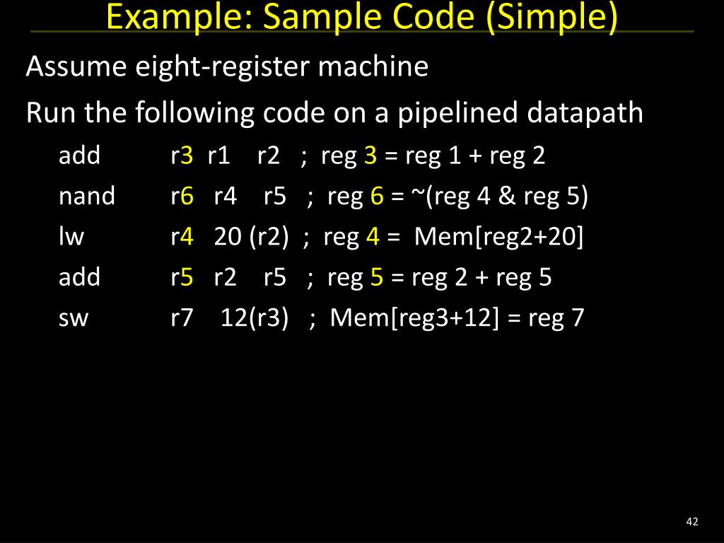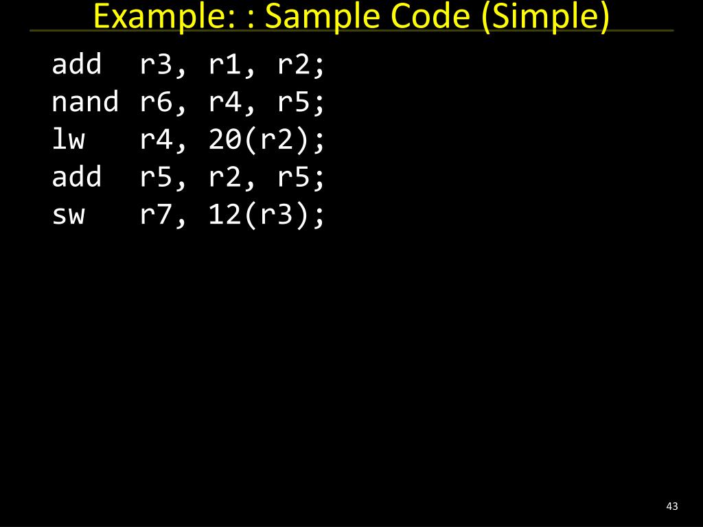 Example: : Sample Code (Simple) • add r3, r1, r2; nand r6, r4, r5; lw r4, 20(r2); add r5, r2, r5; sw r7, 12(r3);