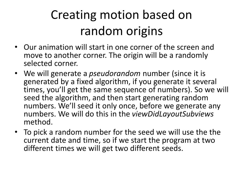Creating motion based onrandom origins • Our animation will start in one corner of the screen and move to another corner. The origin will be a randomly selected corner. • We will generate a pseudorandom number (since it is generated by a fixed algorithm, if you generate it several times, you’ll get the same sequence of numbers). So we will seed the algorithm, and then start generating random numbers. We’ll seed it only once, before we generate any numbers. We will do this in the viewDidLayoutSubviewsmethod. • To pick a random number for the seed we will use the the current date and time, so if we start the program at two different times we will get two different seeds.