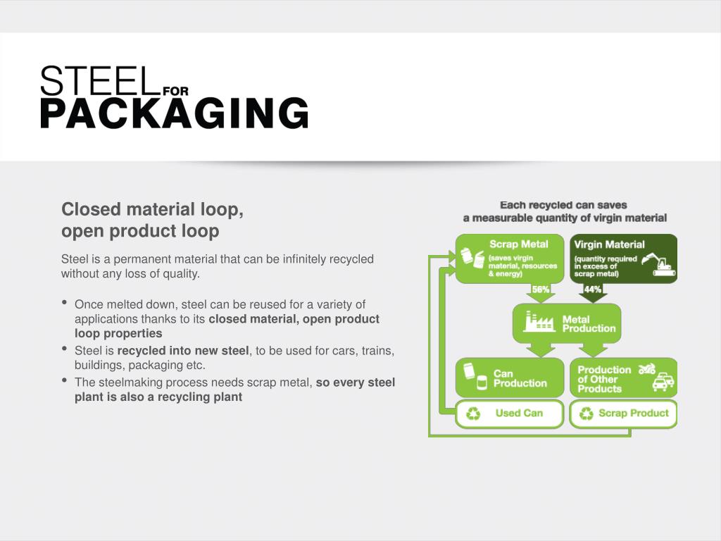 Closedmaterialloop,open productloop Steel is a permanent material that can be infinitely recycled without any lossof quality. Once melted down, steel can be reused for a variety of applications thanks to its closed material, open product loop properties Steel is recycled into new steel, to be used for cars, trains, buildings, packaging etc. The steelmaking process needs scrap metal, so every steel plant is also a recycling plant