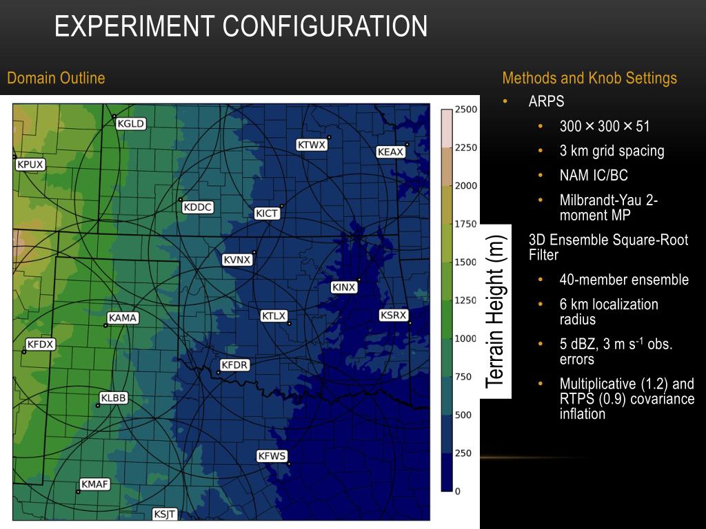 Experiment Configuration Domain Outline Methods and Knob Settings • ARPS • 300×300×51 • 3 km grid spacing • NAM IC/BC • Milbrandt-Yau 2-moment MP • 3D Ensemble Square-Root Filter • 40-member ensemble • 6 km localization radius • 5 dBZ, 3 m s-1obs. errors • Multiplicative (1.2) and RTPS (0.9) covariance inflation Terrain Height (m)