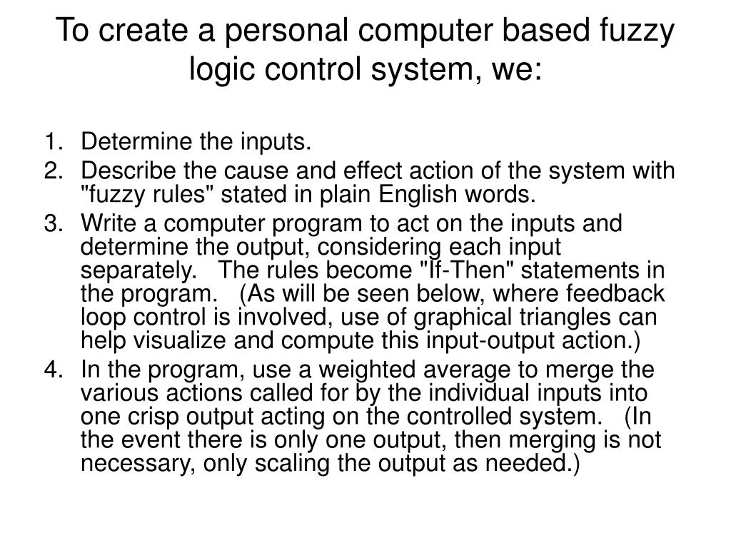 To create a personal computer based fuzzy logic control system, we: • Determine the inputs. • Describe the cause and effect action of the system with "fuzzy rules" stated in plain English words. • Write a computer program to act on the inputs and determine the output, considering each input separately. The rules become "If-Then" statements in the program. (As will be seen below, where feedback loop control is involved, use of graphical triangles can help visualize and compute this input-output action.) • In the program, use a weighted average to merge the various actions called for by the individual inputs into one crisp output acting on the controlled system. (In the event there is only one output, then merging is not necessary, only scaling the output as needed.)