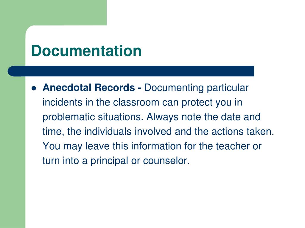 Documentation • Anecdotal Records - Documenting particular incidents in the classroom can protect you in problematic situations. Always note the date and time, the individuals involved and the actions taken. You may leave this information for the teacher or turn into a principal or counselor.