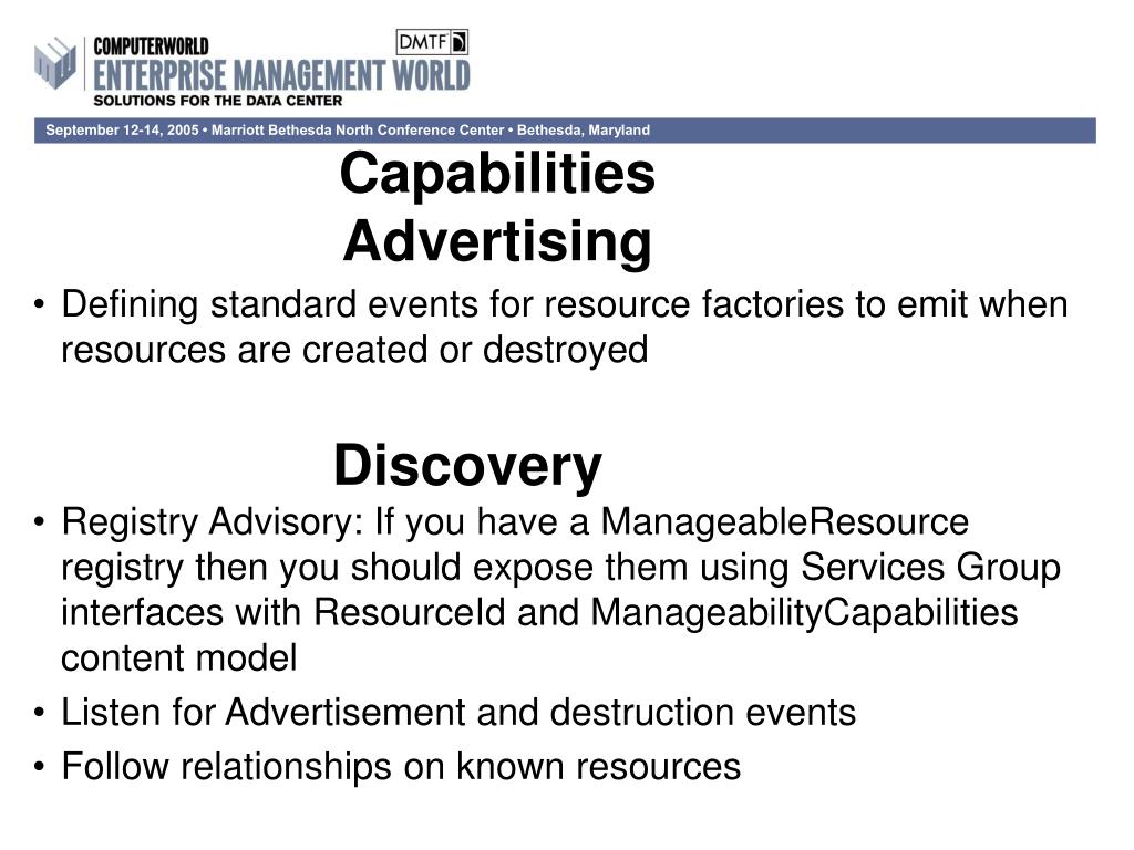 CapabilitiesAdvertising • Defining standard events for resource factories to emit when resources are created or destroyed • Registry Advisory: If you have a ManageableResource registry then you should expose them using Services Group interfaces with ResourceId and ManageabilityCapabilities content model • Listen for Advertisement and destruction events • Follow relationships on known resources Discovery