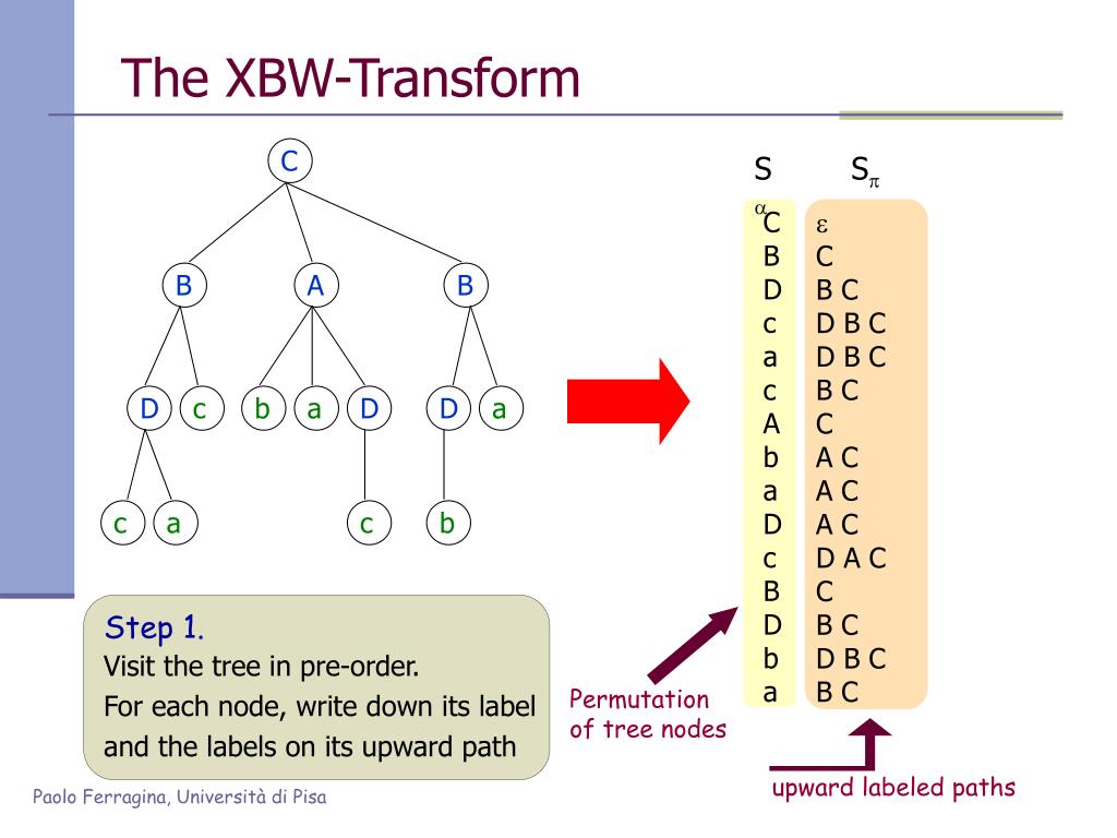 a c C B B D b A a D c D a b c Permutation of tree nodes upward labeled paths The XBW-Transform Sa Sp C B D c a c A b a D c B D b a e C B C D B C D B C B C C A C A C A C D A C C B C D B C B C Step 1. Visit the tree in pre-order. For each node, write down its label and the labels on its upward path Paolo Ferragina, Università di Pisa