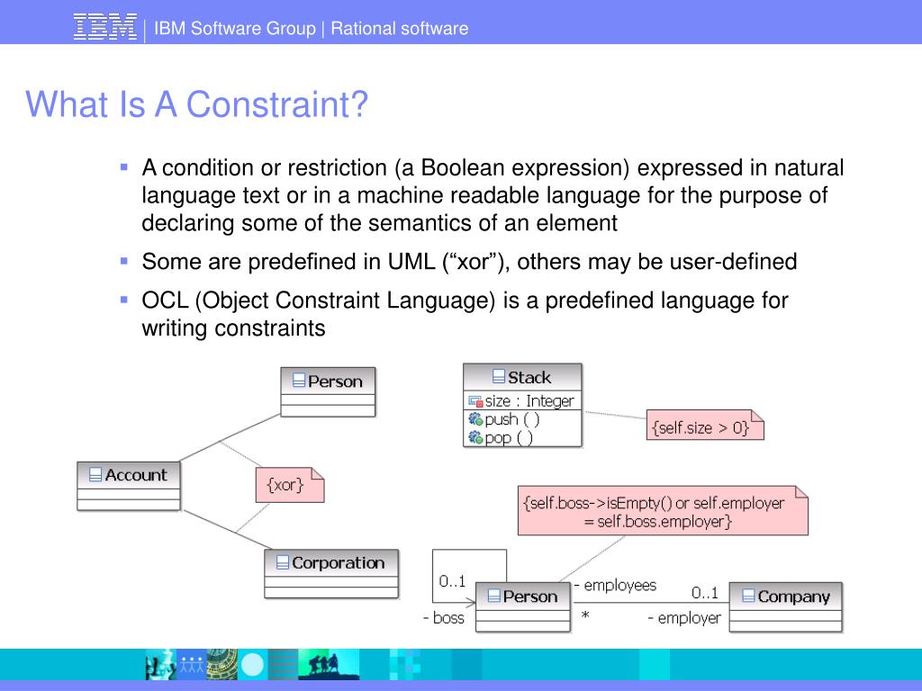 What Is A Constraint? • A condition or restriction (a Boolean expression) expressed in natural language text or in a machine readable language for the purpose of declaring some of the semantics of an element • Some are predefined in UML (“xor”), others may be user-defined • OCL (Object Constraint Language) is a predefined language for writing constraints