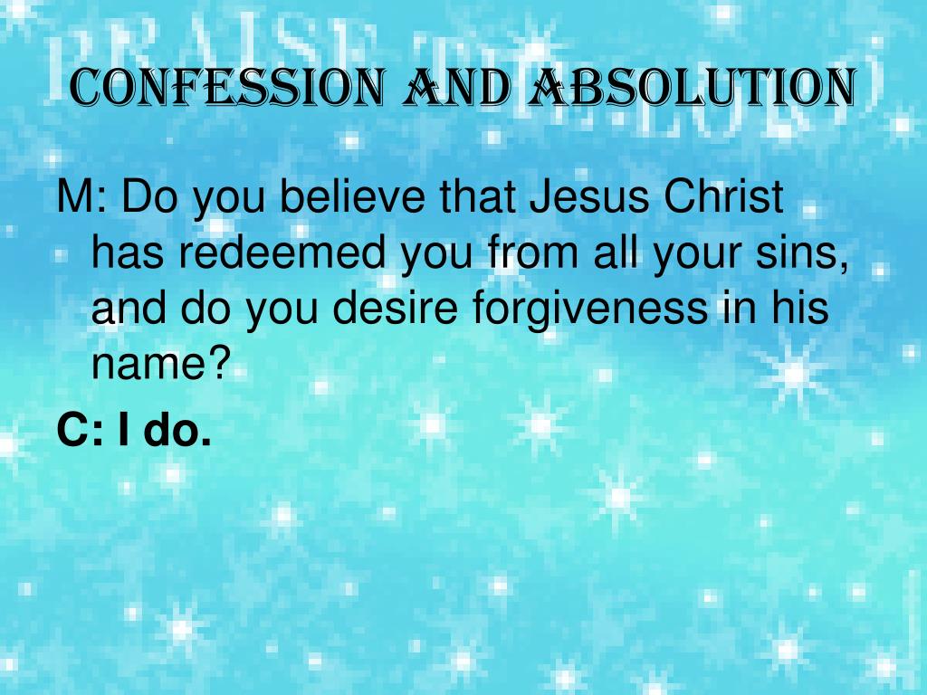 CONFESSION AND ABSOLUTION M: Do you believe that Jesus Christ has redeemed you from all your sins, and do you desire forgiveness in his name? C: I do.