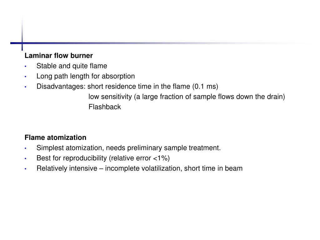 Laminar flow burner • Stable and quite flame • Long path length for absorption • Disadvantages: short residence time in the flame (0.1 ms) low sensitivity (a large fraction of sample flows down the drain) Flashback Flame atomization • Simplest atomization, needs preliminary sample treatment. • Best for reproducibility (relative error <1%) • Relatively intensive – incomplete volatilization, short time in beam