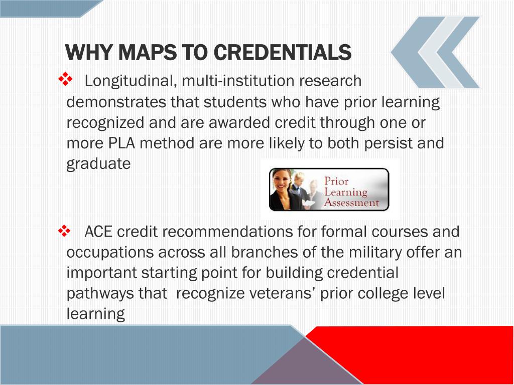Why MAPS to Credentials • Longitudinal, multi-institution research demonstrates that students who have prior learning recognized and are awarded credit through one or more PLA method are more likely to both persist and graduate • ACE credit recommendations for formal courses and occupations across all branches of the military offer an important starting point for building credential pathways that recognize veterans’ prior college level learning