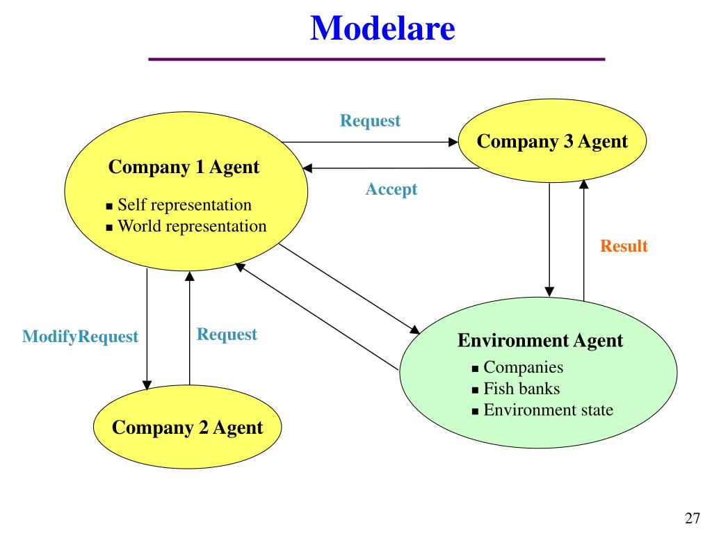 Company 1 Agent • Self representation • World representation Environment Agent • Companies • Fish banks • Environment state Company 2 Agent Company 3 Agent Modelare Request Accept Result Request ModifyRequest 27