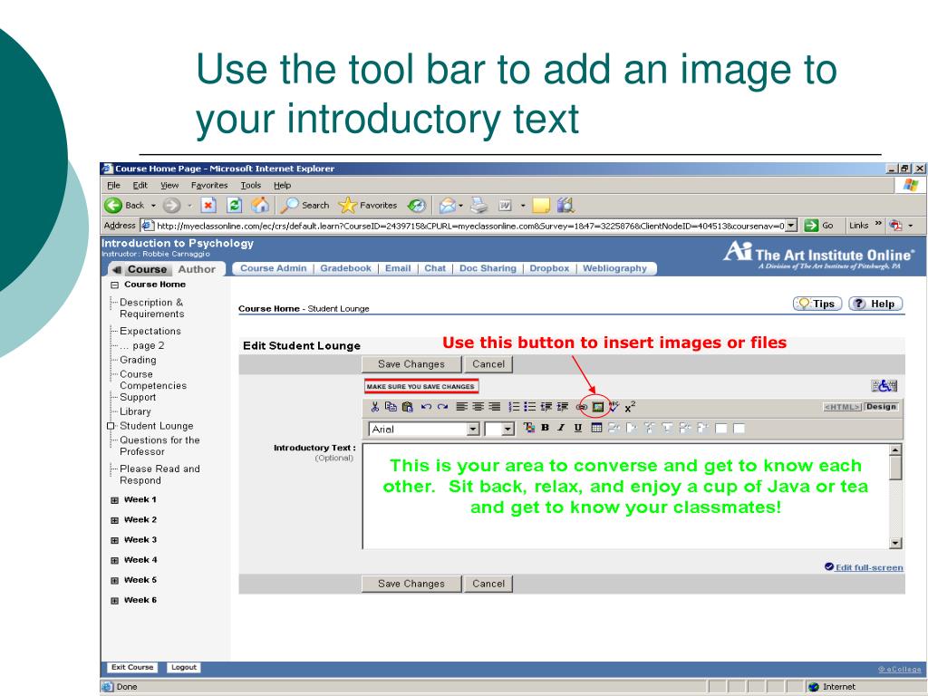 Use the tool bar to add an image to your introductory text Use this button to insert images or files
