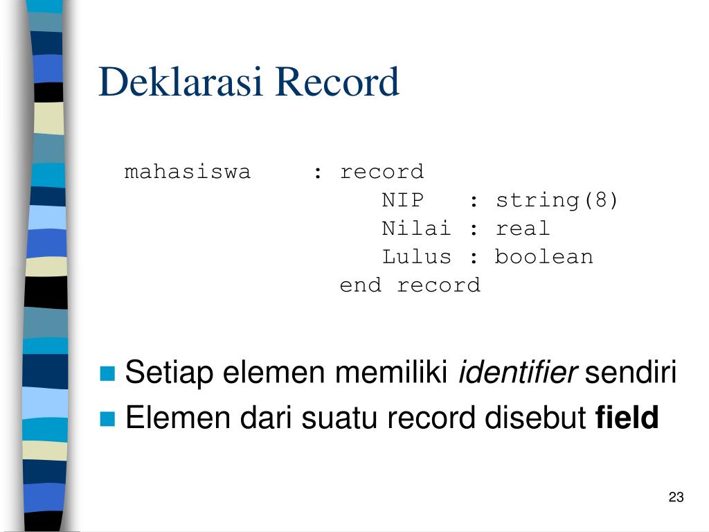 Deklarasi Record mahasiswa : record NIP : string(8) Nilai : real Lulus : boolean end record • Setiap elemen memiliki identifier sendiri • Elemen dari suatu record disebut field