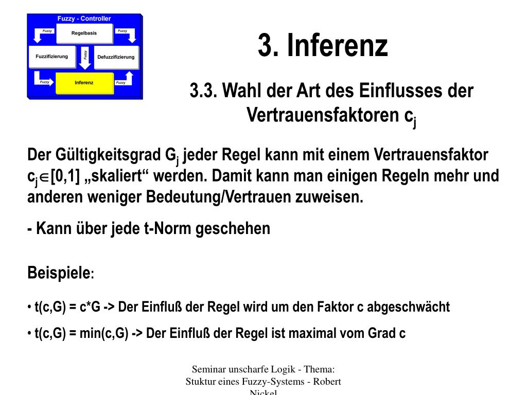 3. Inferenz 3.4. Wahl des Inferenz-Operators • Liefert in Form einer Fuzzy-Menge eine Aussage darüber, wo nach Auswertung einer einzelnen Regel Rj die Steuergröße (Output Y) gewählt werden sollte • D.h.: Die Schlußfolgerung „THEN Y=y_var“ aus der Regelbasis muß noch mit dem gerade berechneten Gültigkeitsgrad Gj „skaliert“ werden. • Diese „Skalierung“ kann über jede t-Norm erfolgen Seminar unscharfe Logik - Thema: Stuktur eines Fuzzy-Systems - Robert Nickel