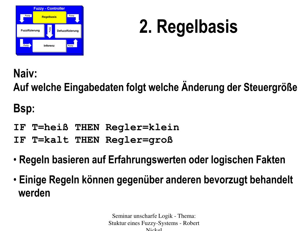 2. Regelbasis • Naiv: Auf welche Eingabedaten folgt welche Änderung der Steuergröße • Bsp: • IF T=heiß THEN Regler=kleinIF T=kalt THEN Regler=groß • Regeln basieren auf Erfahrungswerten oder logischen Fakten • Einige Regeln können gegenüber anderen bevorzugt behandelt werden Seminar unscharfe Logik - Thema: Stuktur eines Fuzzy-Systems - Robert Nickel